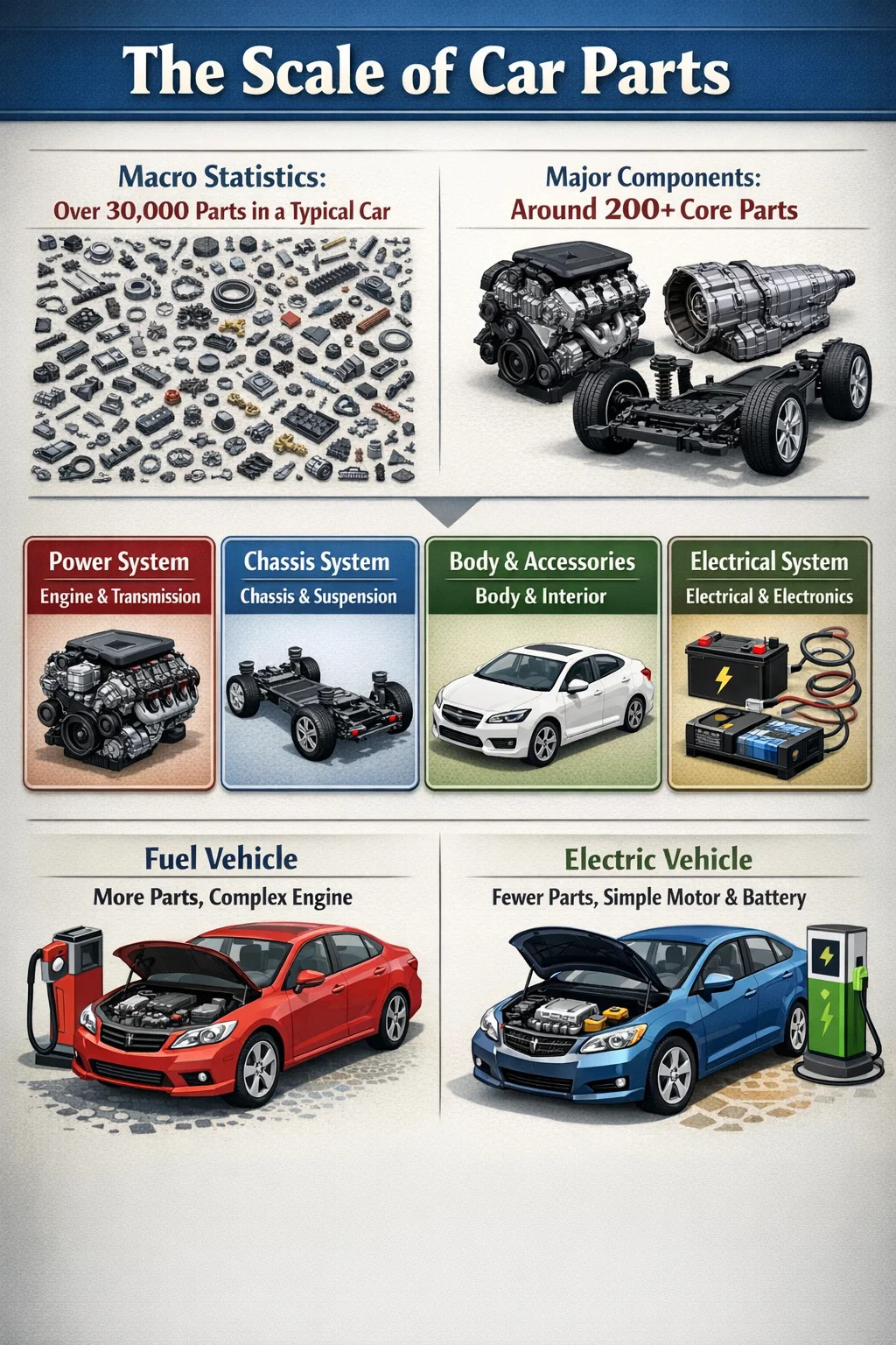 Wenn wir unsere Perspektive ändern und komplexe mechanische Baugruppen wie Motor, Getriebe und Fahrwerk als einzelne Einheiten betrachten, dann besteht ein Auto aus etwa mehreren hundert Hauptkomponenten. Diese Klassifizierung ähnelt eher dem, was wir normalerweise in Reparaturwerkstätten hören.