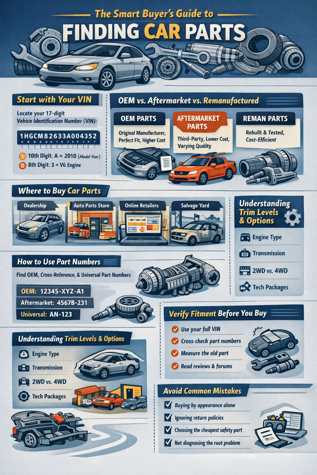 Bei der Suche nach den richtigen Teilen für Ihr Auto kommt es auf einen nicht verhandelbaren Ausgangspunkt an: Sie müssen das Baujahr, die Marke, das Modell, die Motorgröße und die Ausstattungsvariante Ihres Fahrzeugs kennen, bevor Sie danach suchen Automobilteil . Ohne diese Informationen kann selbst ein identisch aussehendes Teil nicht richtig passen oder funktionieren. Sobald Sie diese Details gesichert haben, wird der Prozess viel einfacher – egal, ob Sie bei einem Händler, einem Online-Händler, einem Schrottplatz oder einem Autoteilehändler kaufen. Dieser Leitfaden führt jeden Schritt dieses Prozesses mit praktischen Details durch.