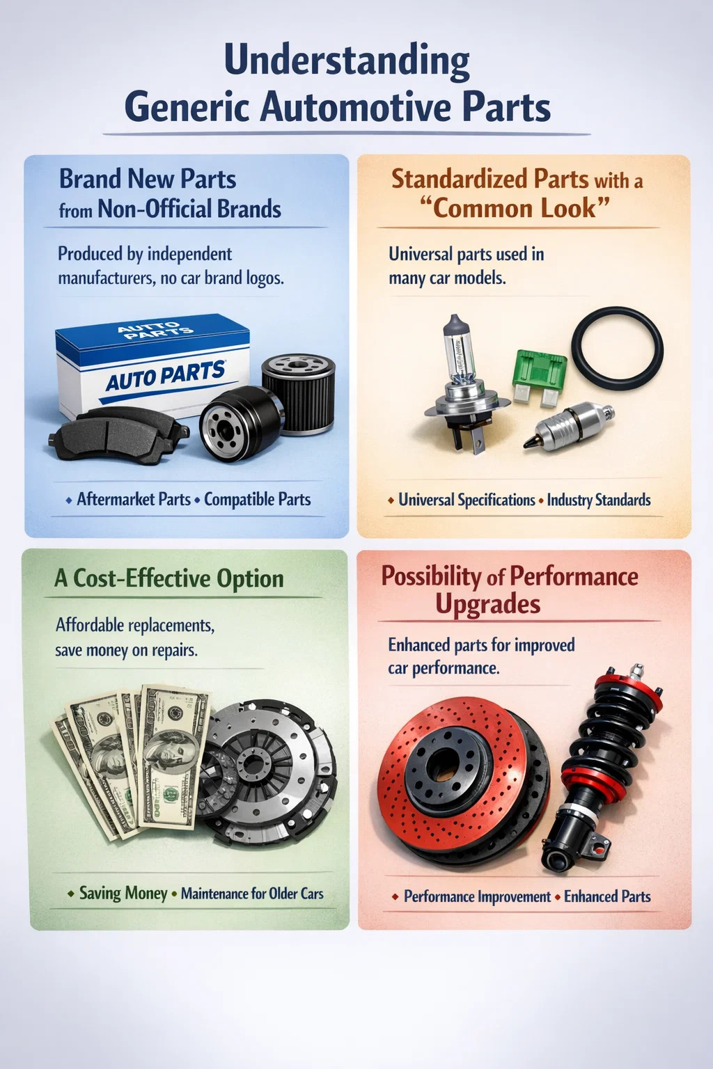 Als „Generikateile“ oder „Markenalternativteile“ bezeichnen wir gemeinhin Autoteile die nicht direkt vom Autohersteller hergestellt werden, sich aber perfekt in das Auto einbauen lassen. Man kann sie sich als „Generika“ in der Pharmaindustrie oder als „Zubehör von Drittanbietern“ für Mobiltelefone vorstellen.