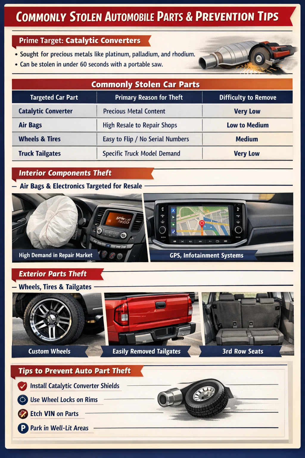 Diebe konzentrieren sich im Allgemeinen auf Autoteile die leicht zu entfernen und schwer zu verfolgen sind. Die folgende Tabelle zeigt die häufigsten Ziele und warum sie gestohlen werden.