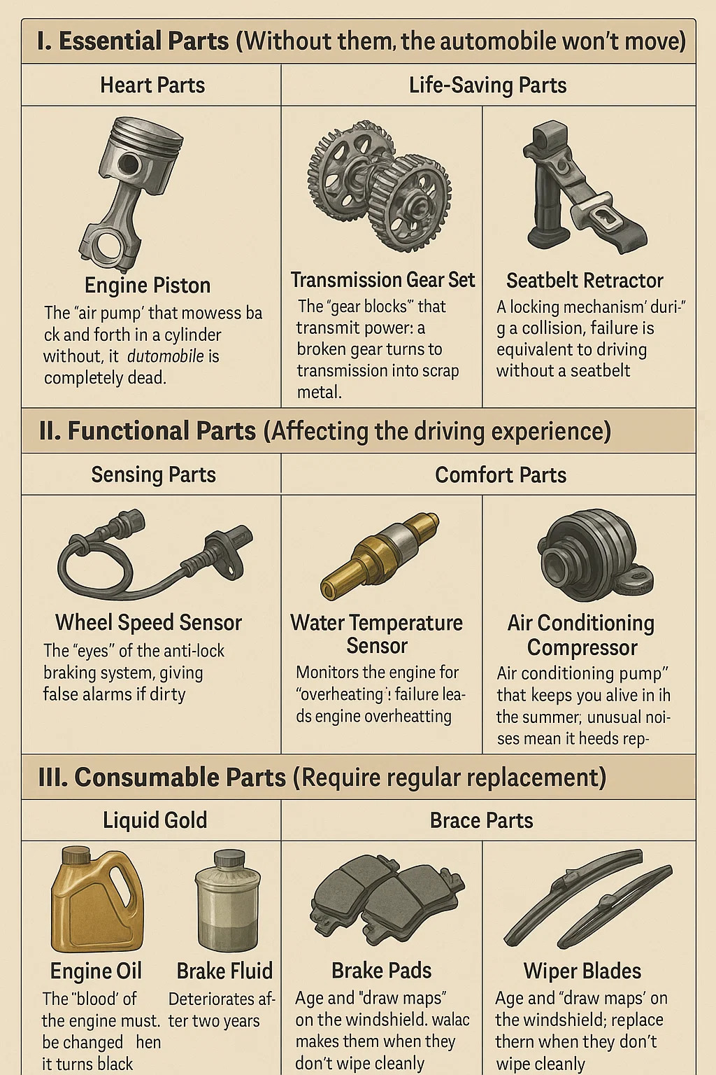 Autoteile sind die „Organe“, aus denen ein Automobil besteht; Das Fehlen eines entscheidenden Teils macht das Auto funktionsunfähig, während zusätzliche dekorative Teile es nur noch auffälliger machen.